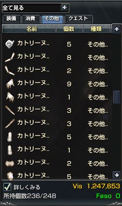 カトリーヌのパーツが揃った時の個数。お金も1Mを超えた。